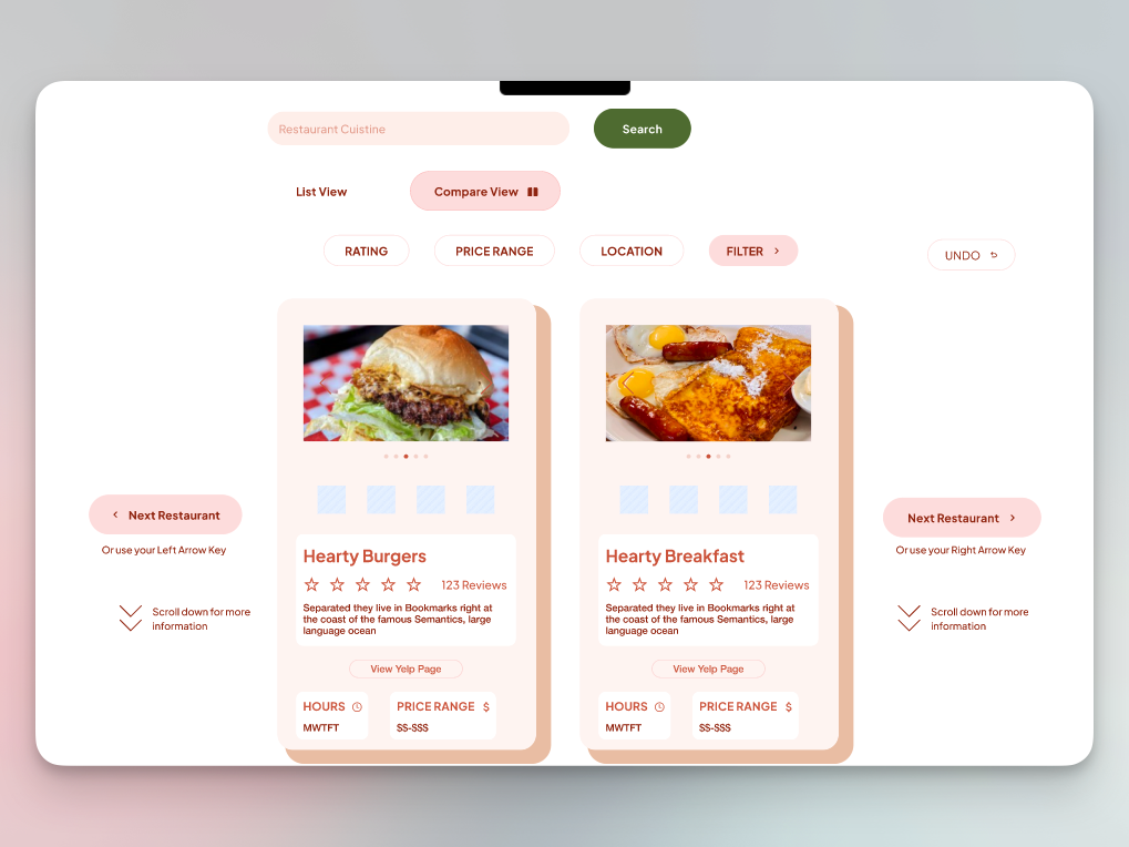 Many users experience decision fatigue when choosing a restaurant, as existing platforms often present extensive information without facilitating direct comparisons. Swipe & Dine addresses this by introducing a streamlined, swipeable comparison tool, making restaurant selection quick, intuitive, and engaging.